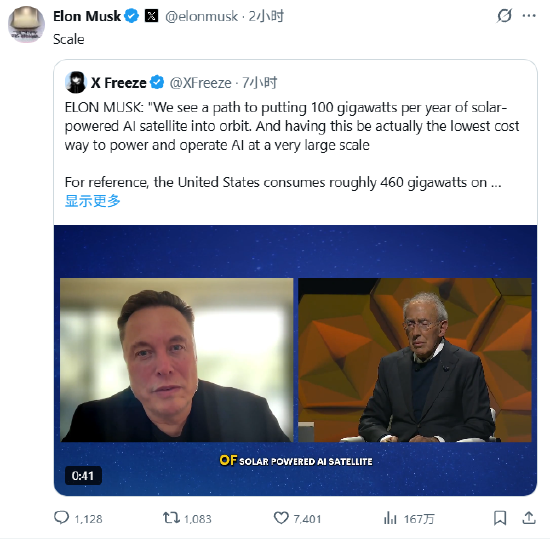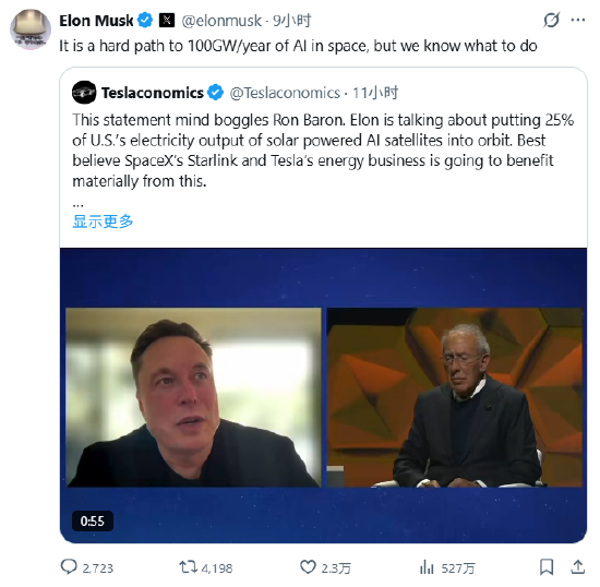 在另一条帖子中,马斯克说:“要在太空中每年部属100吉瓦的人工智能,这是一条艰难的道路,但我们知道该怎么做。”