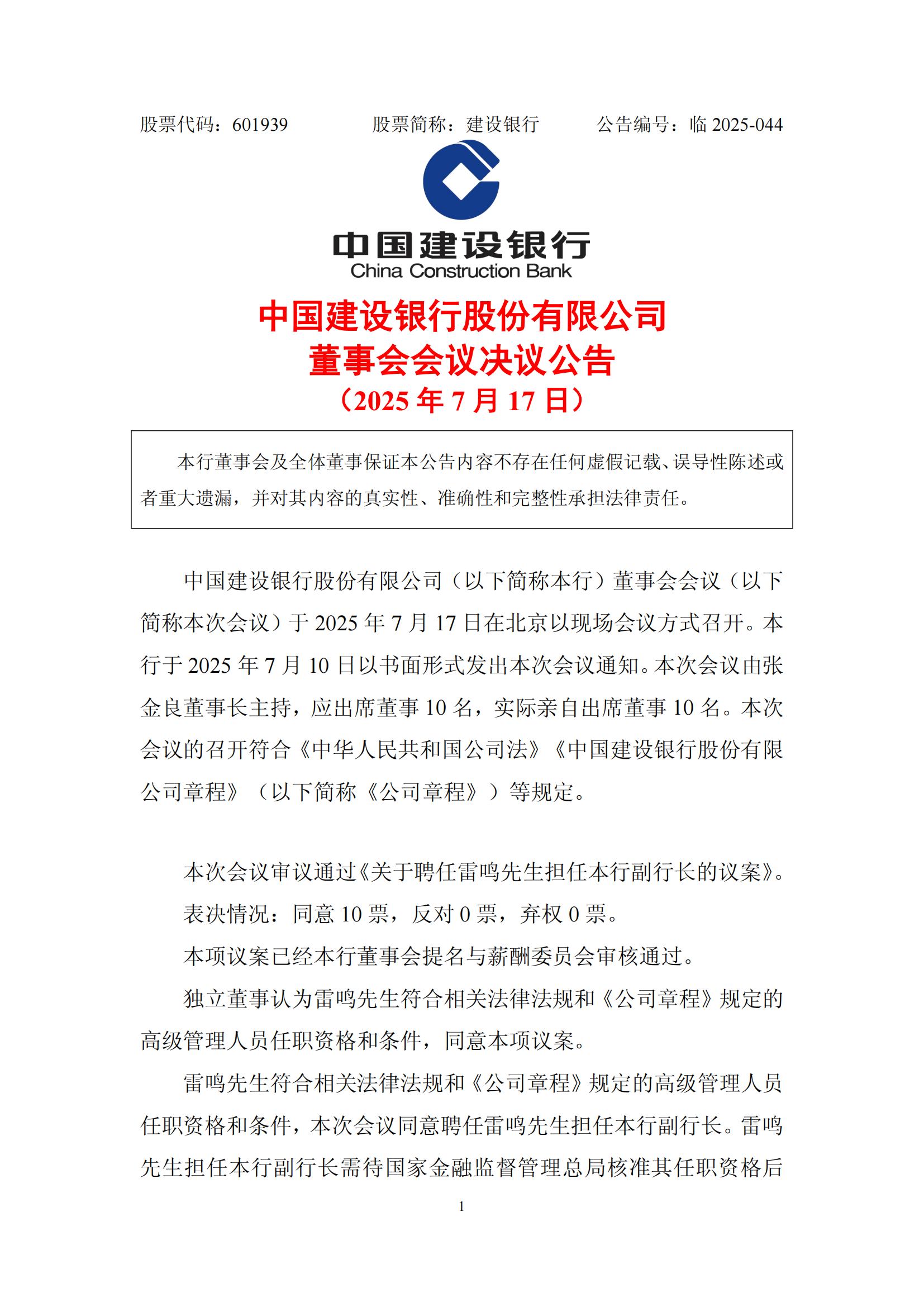 7月17日金融一线消息,建设银行今日发布董事会会议决议公告表示,会议审议通过《关于聘任雷鸣先生担任本行副行长的议案》,同意聘任雷鸣担任建设银行副行长。雷鸣担任该行副行长需待国家金融监督管理总局核准其任职资格后履职。