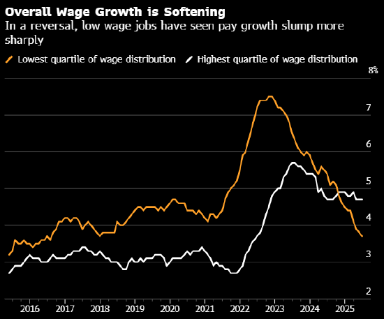 部分分析人士曾预测,特朗普政府近期对移民的打击(这些移民多在低薪岗位工作)可能会推高低端劳动力市场的工资水平。但亚特兰大联储数据显示,该群体目前的工资增速为2017年以来最慢。