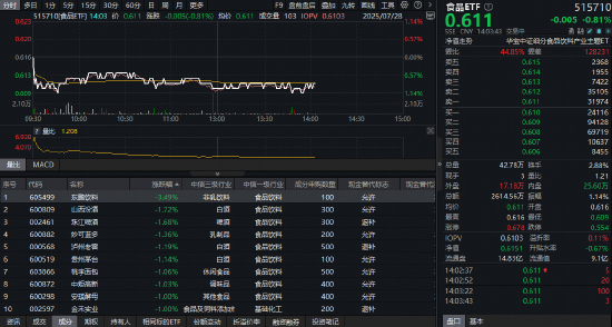 本文概览: 今日(7月28日),吃喝板块继续回调,反映吃喝板块整体走势的食品ETF(515710)几乎全天低位震荡,截至发稿,场内价格跌0.81%。 成份股方面,部分大众品及白酒龙...