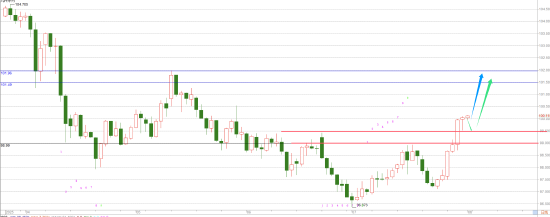 日线这里,已经站稳100关口上方,那么下个目标大概率就是要触及101.5--102.0这里。